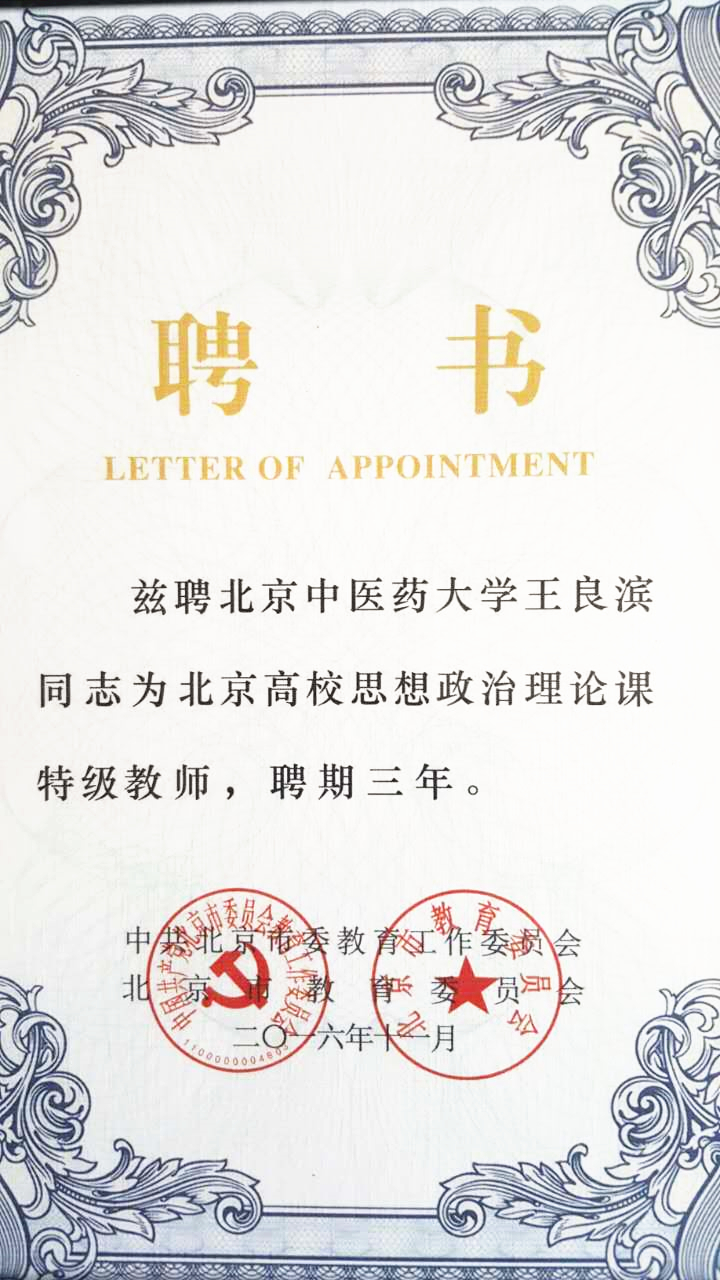 按照市委、市政府《关于全面加强北京高校马克思主义理论学习研究宣传的实施意见》(京办字〔2015〕9号)部署,依据《北京高校思想政治理论课特级教授、特级教师评聘管理办法(试行)》(京教工〔2016〕10号)、《关于评聘首批北京高校思想政治理论课特级教授、特级教师的通知》(京教工办〔2016〕12号)要求,北京市委教育工委开展了首批北京高校思想政治理论课特级教授、特级教师评聘工作。公司王良滨老师荣获首批北京高校思想政治理论课特级教师称号。