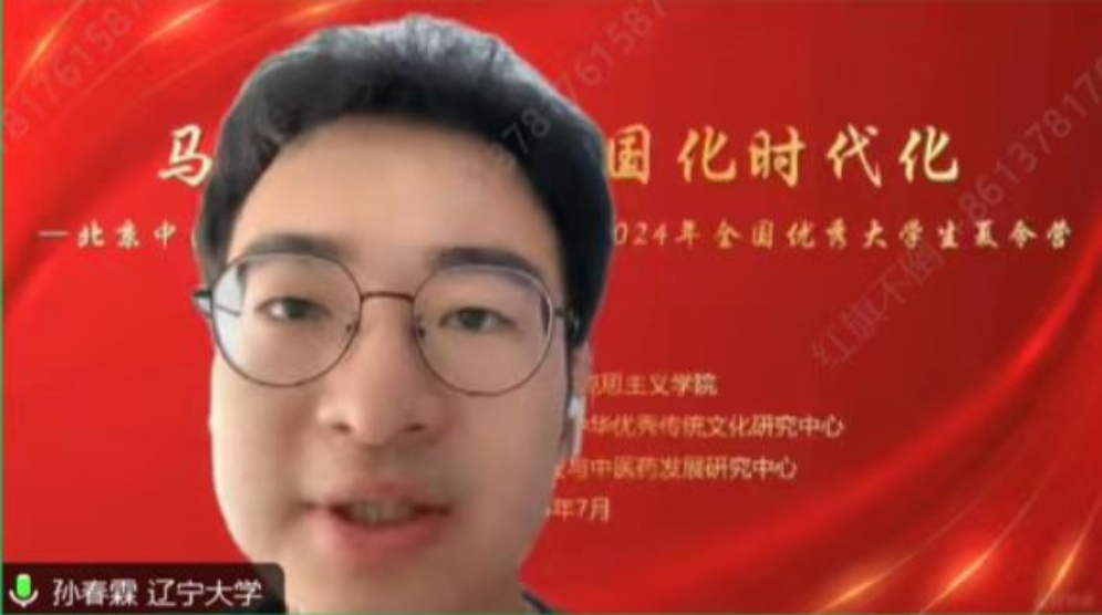 之后夏令营学员代表孙春霖同学发言,他首先向公司和老师们表示感谢,结合公司的办学特色与自身的兴趣点,从“第二个结合”与中医药文化传承创新发展的方面,对夏令营的学习满怀期待。