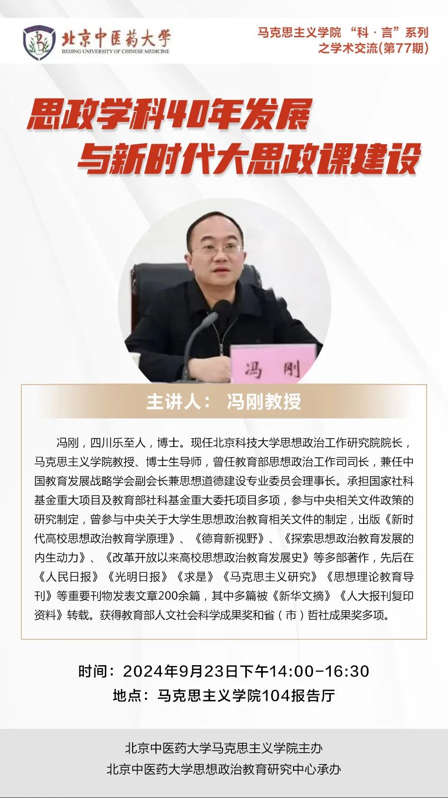 为深入学习贯彻党的二十届三中全会精神,落实习近平总书记对公司思政课建设作出的重要指示精神,9月23日,“科·言”系列学术交流第77期顺利开展,中国教育发展战略学会副会长、思想道德专业委员会理事长、北京科技大学思想政治工作研究院经理、博士生导师冯刚教授应邀为yl23455永利师生作题为“思想政治教育学科40年发展与新时代大思政课建设”的报告。会议由yl23455永利经理邱仁富主持。