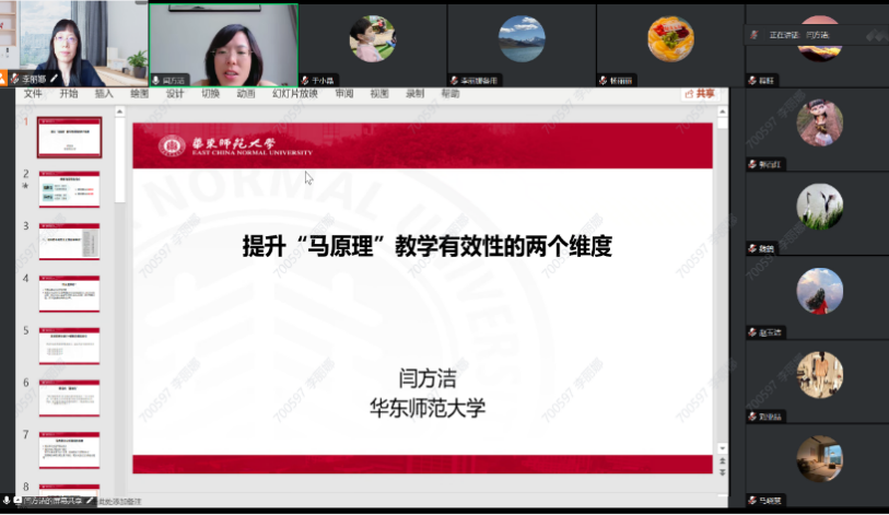 聚焦推动马克思主义中国化时代化的教学研究,“马克思主义基本原理”教研室邀请中央马工程教材编写组成员、教育部青年长江学者、中宣部思想文化宣传青年英才、yl23455永利闫方洁教授围绕提升“马克思主义基本原理”教学有效性的两个维度展开深入阐释和经验分享。她指出教学中应体现和融入透彻的理论意识和敏锐的现实意识,展示和讲解了日常教学中她所运用的精彩教学课件和教学设计。从比较视域下的广度、问题意识的深度和对象意识的温度三个方面切入,指导如何将教材体系转化为教学体系。