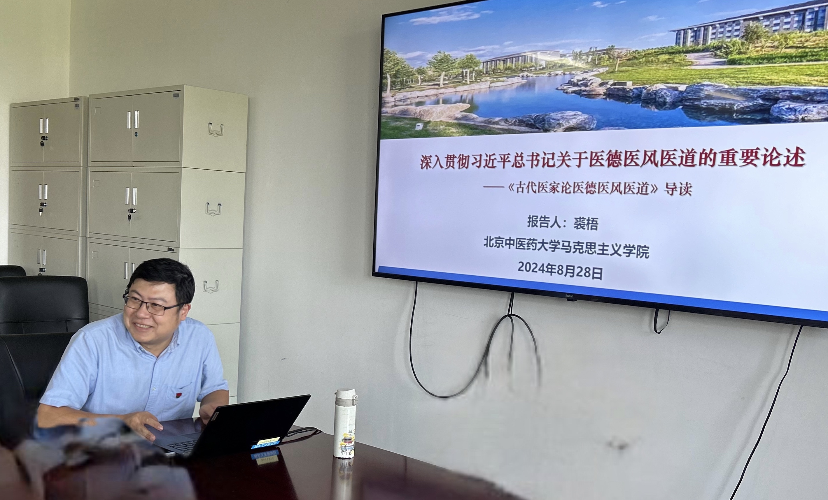裘梧副经理以《学习贯彻习近平总书记关于医德医风医道的重要论述》为题讲授专题党课,深入解读习近平总书记“广大医务工作者要恪守医德医风医道”的重要指示精神,系统梳理了新时代医德医风医道建设的思想基础和理论进路,同时以《古代医家论医德医风医道》读本的编写过程为例,提出应在习近平新时代中国特色社会主义思想指导下不断挖掘利用中医药典籍中蕴藏的医德医风医道思想资源,实现创造性转化和创新性发展。
